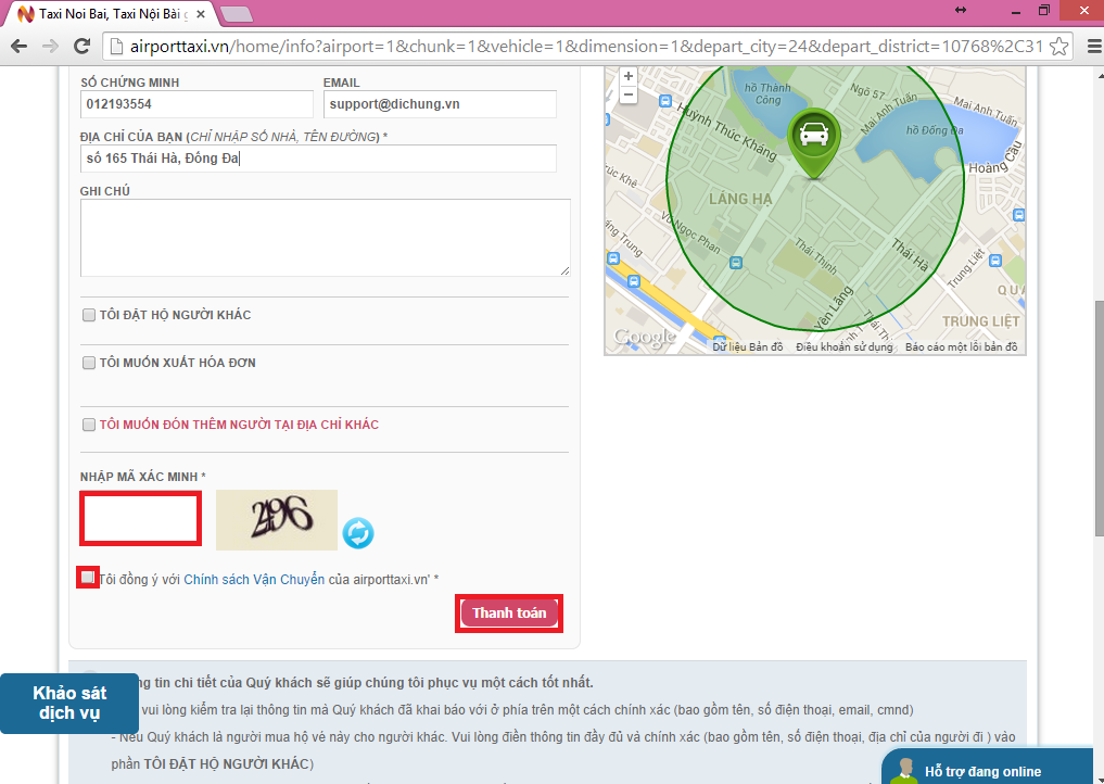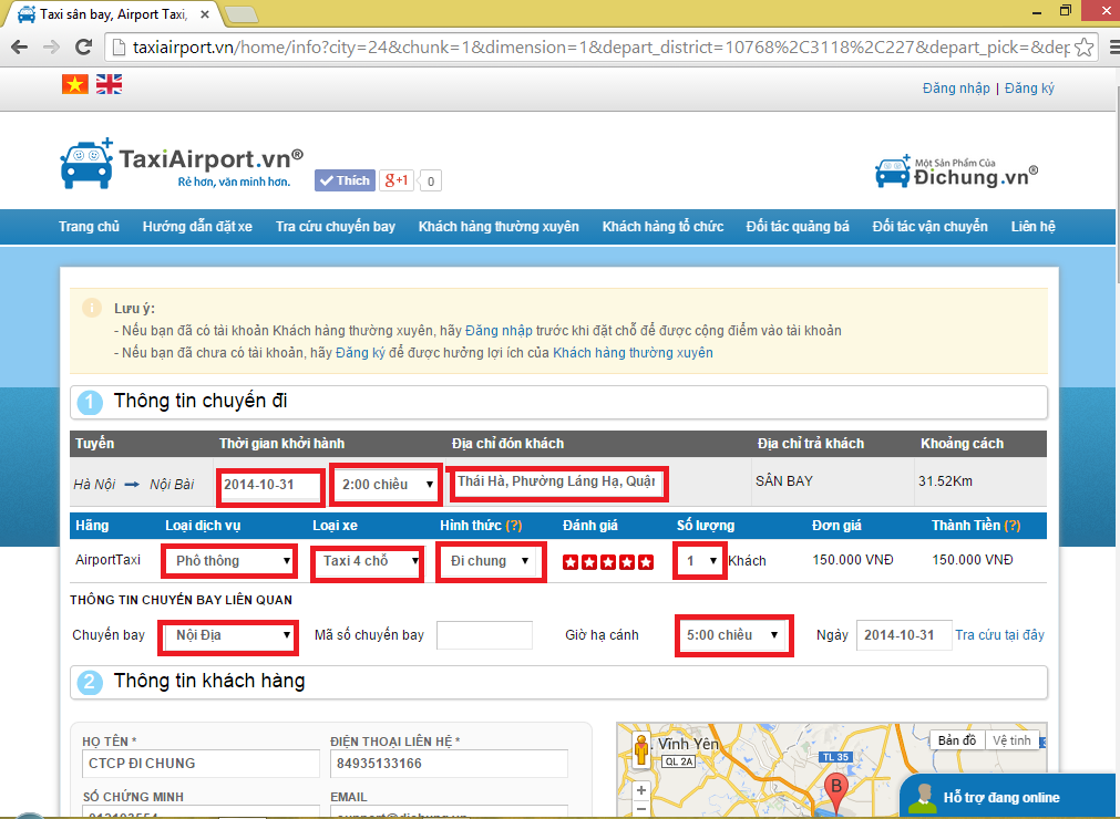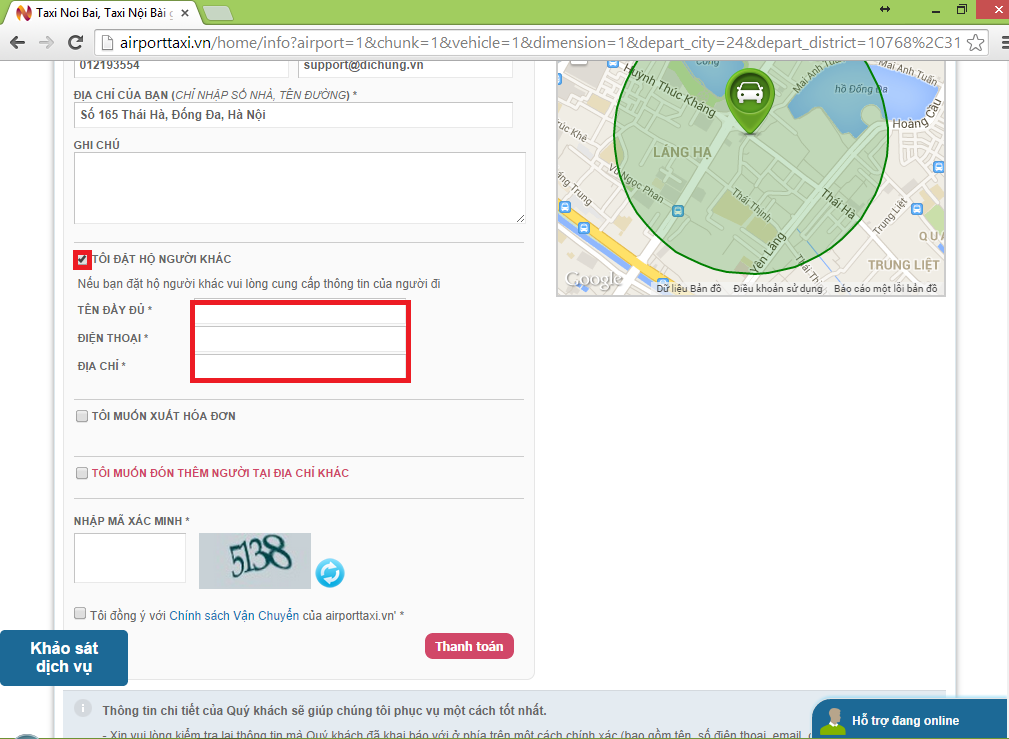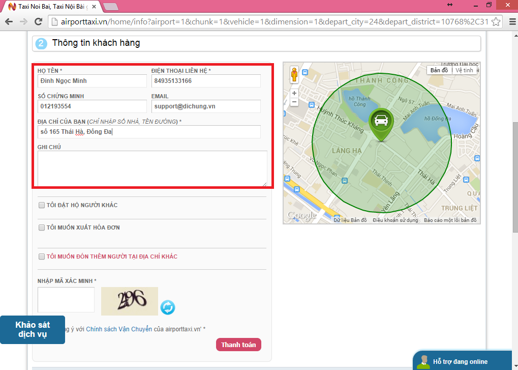 Bước 8: điền thông tin khách hàng: tên, số điện thoại liên hệ, số chứng minh thư hoặc hộ chiếu, địa chỉ email, địa chỉ đón chính xác và các ghi chú nếu có: