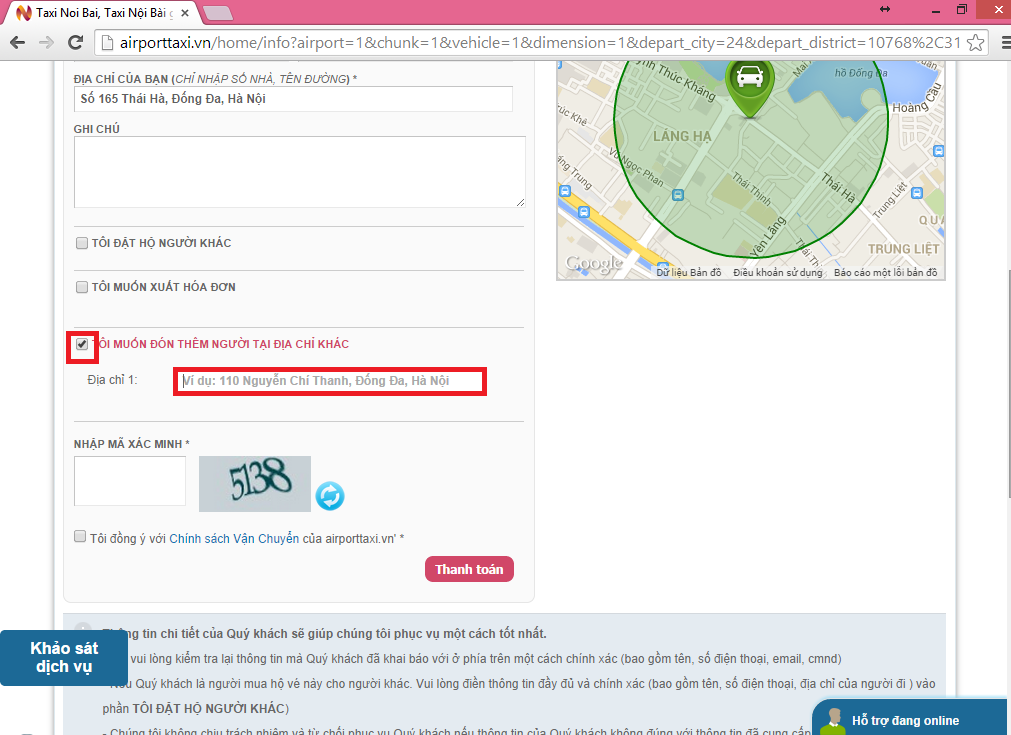 Bước 4: Click vào mục “Địa chỉ đón/trả khách” và nhập địa chỉ muốn đón/trả theo đường phố: