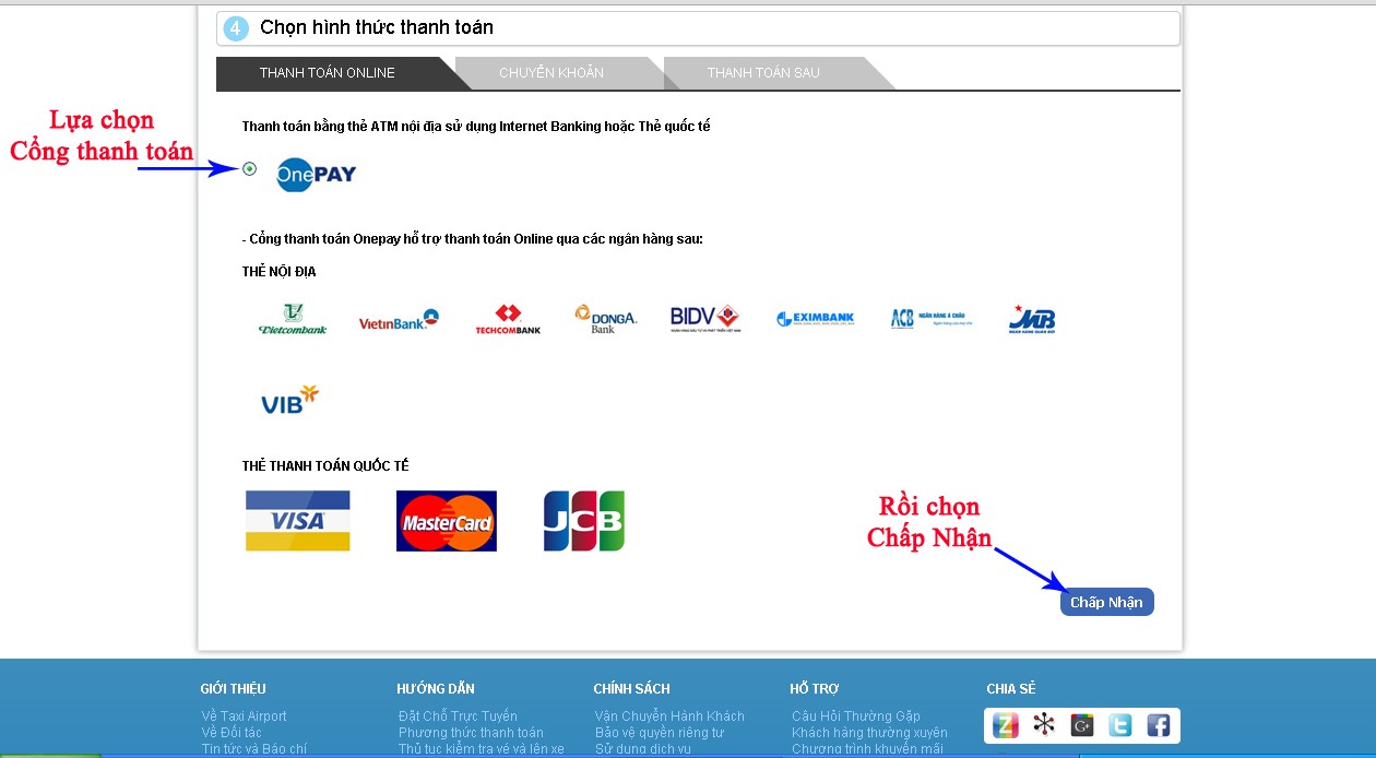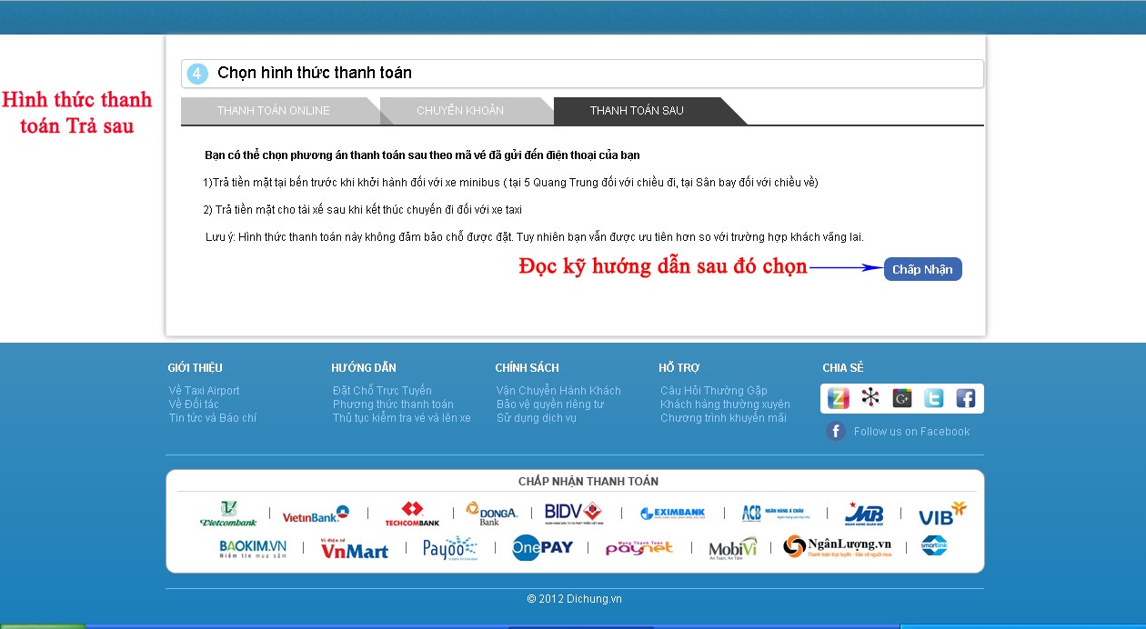 Bước 11: Lựa chọn hình thức thanh toán phù hợp: trả trước (bằng thẻ thanh toán nội địa hoặc quốc tế), chuyển khoản (chuyển tiền với nội dung thanh toán mã vé của mình) hoặc trả sau (thanh toán trực tiếp cho lái xe sau khi sử dụng dịch vụ):