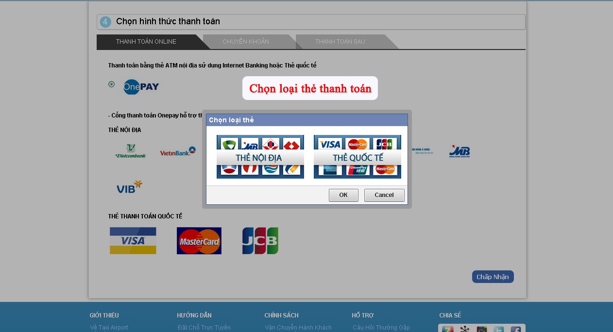 + Chọn loại thẻ thanh toán (thẻ nội địa hoặc thẻ quốc tế)