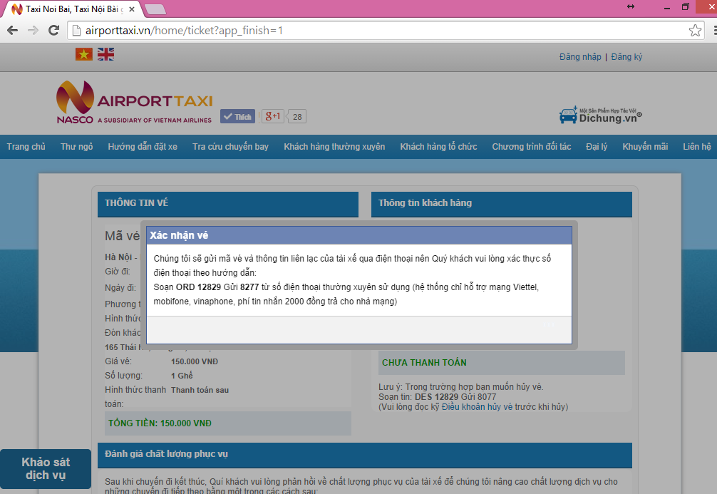 Bước 12: Nhắn tin theo cú pháp hiện ra trên màn hình (chi phí 2.000đ/SMS), thông tin về mã vé đặt xe sẽ được tự động gửi về số điện thoại di động của khách hàng (cả người đặt và người được đặt hộ - nếu có).